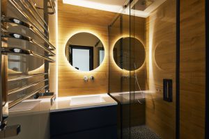 Dans la salle de bain, l’éclairage doit être à la fois fonctionnel et sécurisé. Un plafonnier étanche est nécessaire pour l’éclairage général.